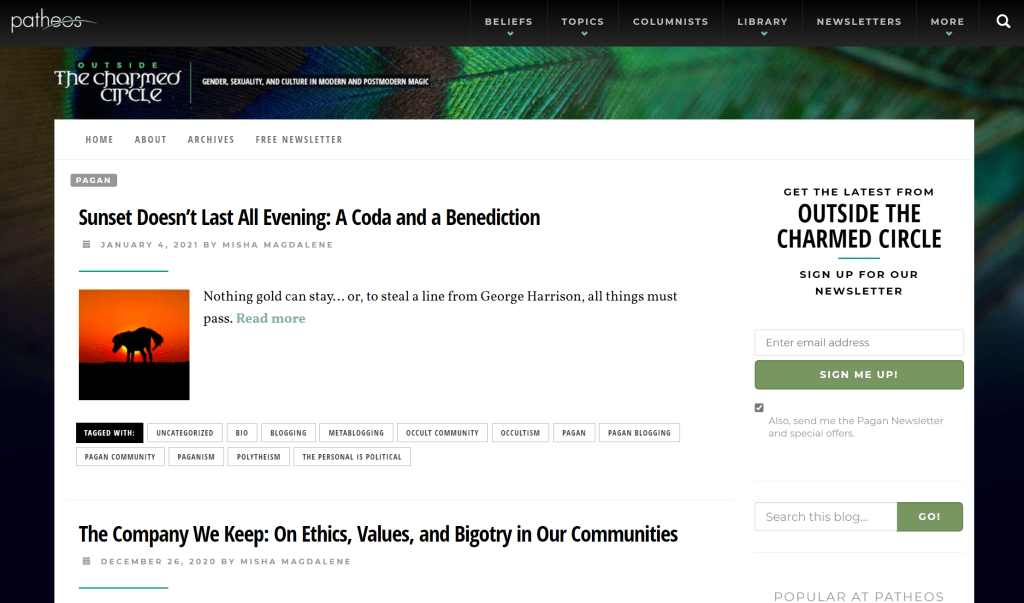 From August 2017 to January 2020, I wrote the Outside the Charmed Circle blog for the Patheos Pagan Channel, where I wittered on at some length about gender, sexuality, magic, witchcraft, devotional polytheism, theology, philosophy, politics, and my ongoing fixation with working as many references to Dungeons & Dragons and Stranger Things into completely unrelated topics as I could.